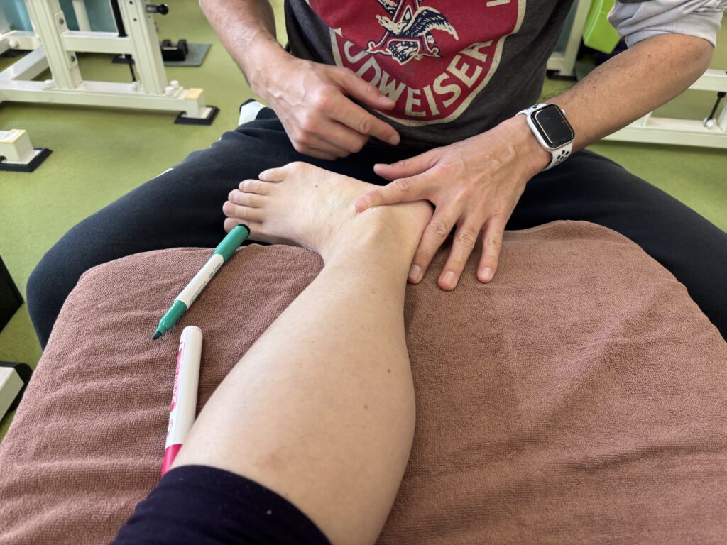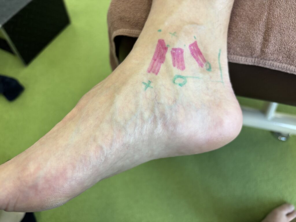 足関節(足首)の不調改善や調整に関わる骨・筋肉・腱・靭帯の場所をマーキング。どこにどうやってくっついているのか、どう重なっているのか、どのような働きをするのか。それを理解し、触察(触って確認すること)ができるようにしていきます。