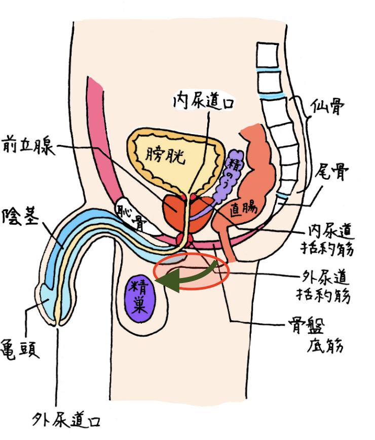 男性の長い尿道はカーブがあり、その尿道からしっかり出し切るための筋肉があります。その、押し出す筋肉が弱ってくると、長い尿道におしっこが残ってしまい、