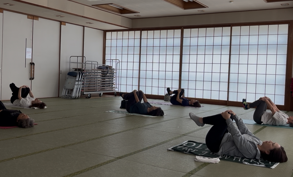 セミナーのために入手したプロジェクターがなかなか調整うまくいかず、大変見えにくいスライドになってしまいましたが、「痛みとは」「改善のためには」などの講義を皆さん熱心に聞いていただいて、約1時間の実技で心地よく体を緩め・ほぐし・伸ばしていただきました。