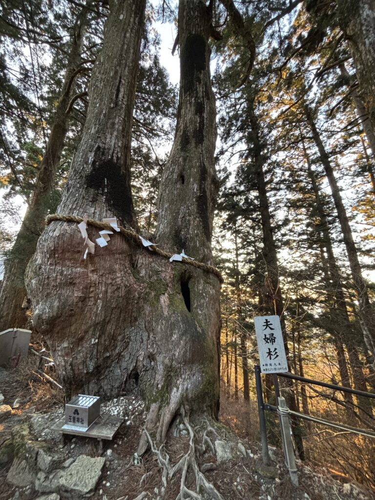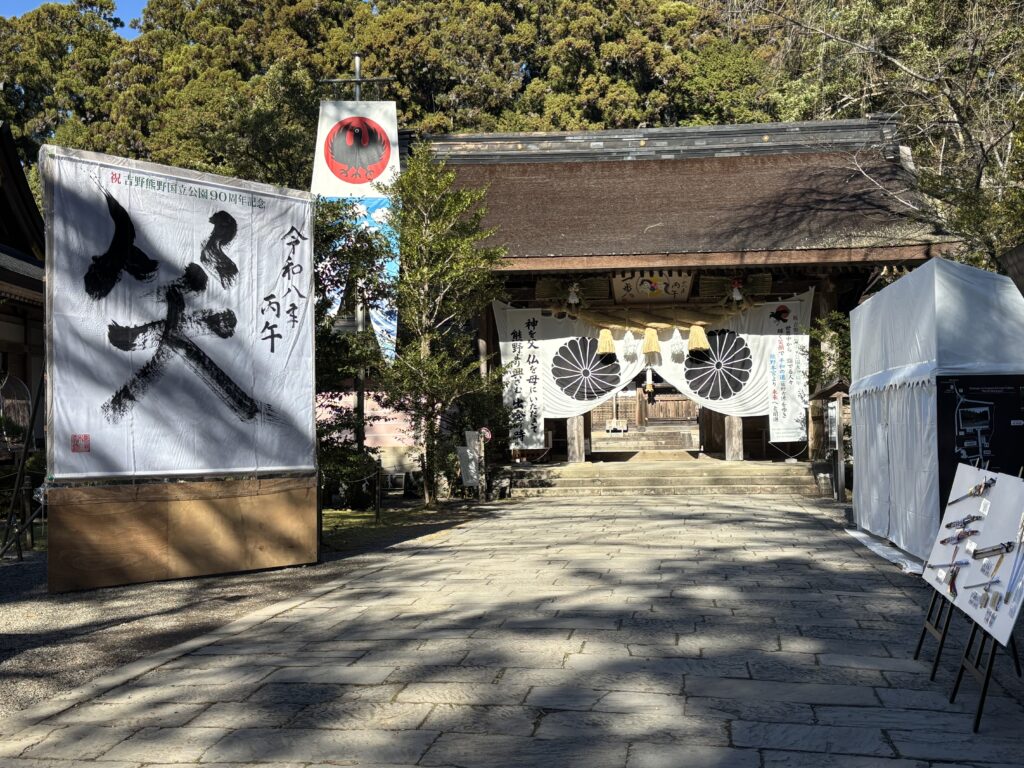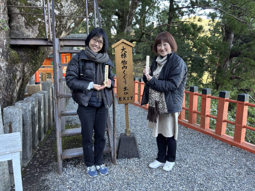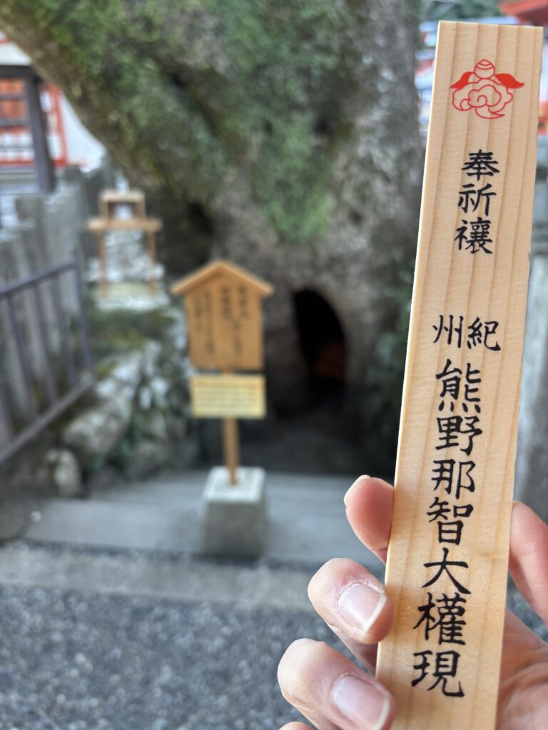 主祭神は熊野夫須美大神(くまのふすみのおおかみ)=伊邪那美命(いざなみのみこと)。「結びの宮」と呼ばれ、古くから人のご縁だけでなく様々な願いを結ぶお宮として崇められているそうです。願いを書いた護摩木を持って、大楠胎内くぐりをしてきました。