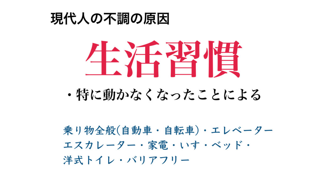 こんなに動かなくて生きていける時代は人間史上なかったわけですが、人間の長い歴史をかけてできあがった体の作りは、数十年の文化の進歩に即対応できるほど簡単ではないのですよね。